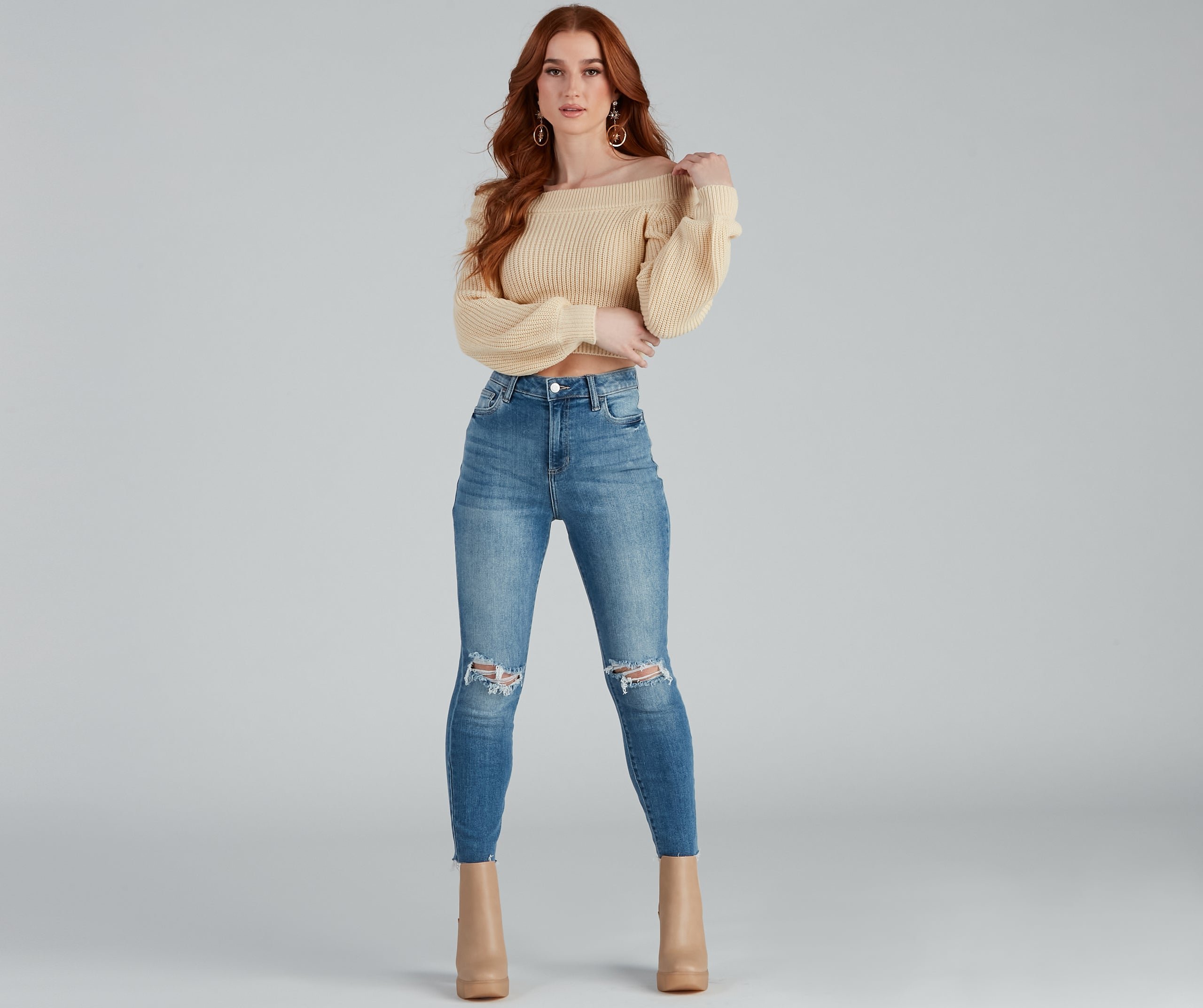 Keep your look cute in this off-the-shoulder sweater featuring long sleeves, cropped hem, and a rib-knit fabric with a moderate stretch. Complete the look with skinny