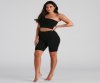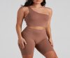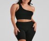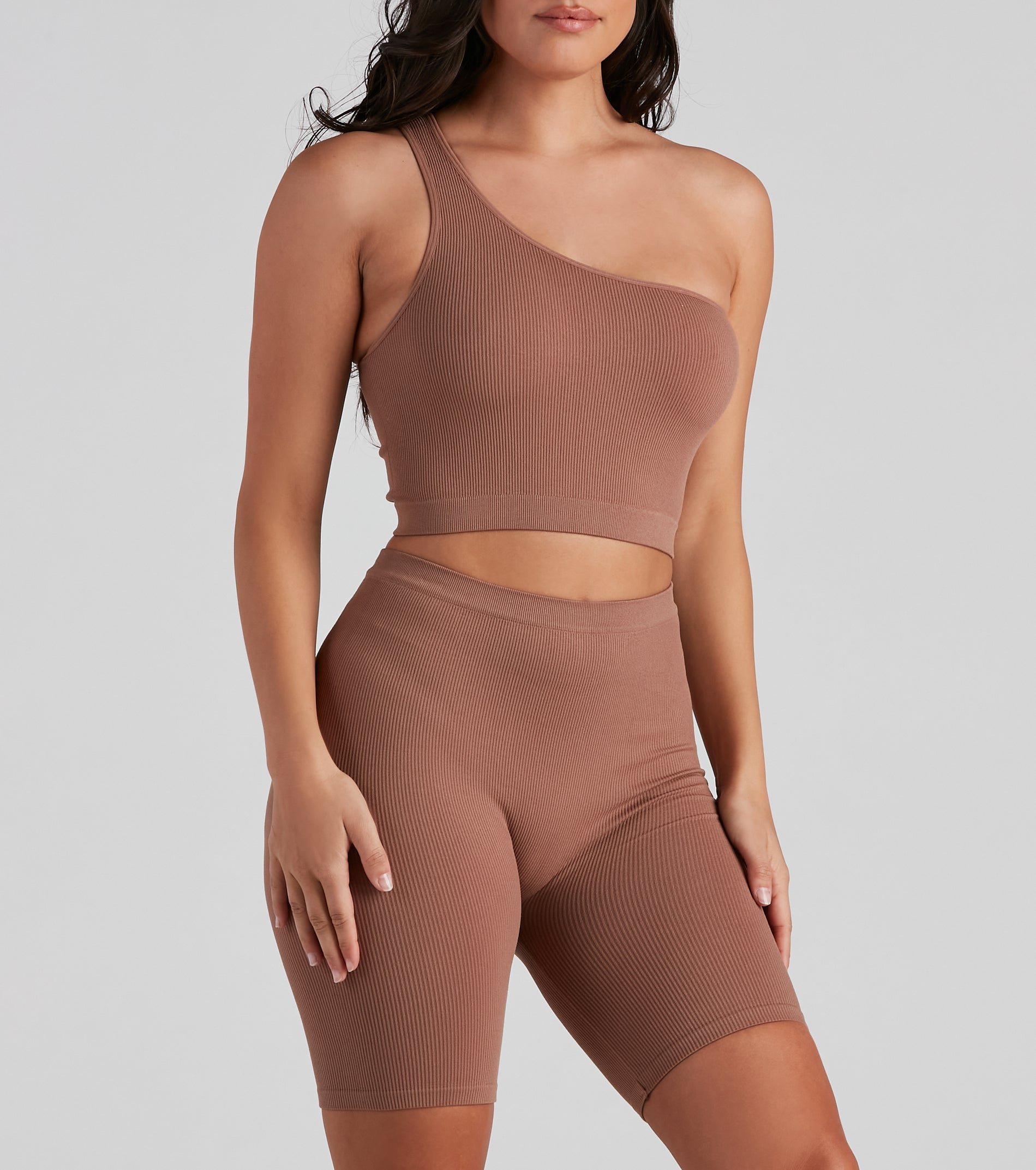 You deserve some leisure time this weekend! Look cute lounging in this seamless rib-knit set featuring an asymmetrical one-shoulder crop top and matching high-rise biker shorts. Complete the look in cozy