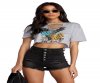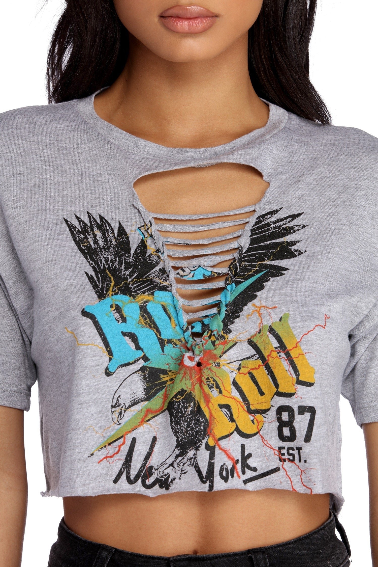 Everyone loves a classic slasher! This cute tee has a crew neck paired with short sleeves and a slashed front with a braided detail that features a colorful "rock and roll" screen print. The cropped tee is composed of a heathered knit and offers plenty of stretch.
