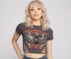 Amp up your everyday look with this edgy cropped graphic tee. It features a crew neckline, short sleeves, slashed detailing on the sides, and a center motorcycle and wings graphic with the main script that reads, "Custom Motorcycle Team Los Angeles," and "Two Wheels Move The Soul." Style this tee with cutoff denim shorts and