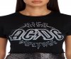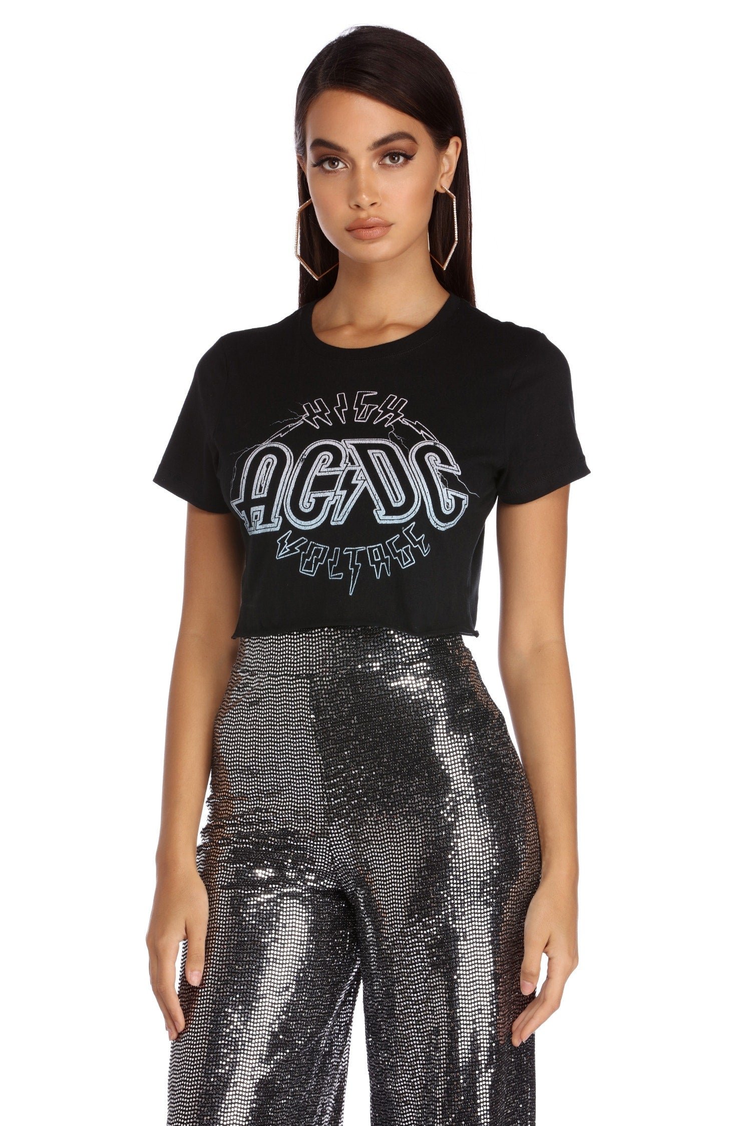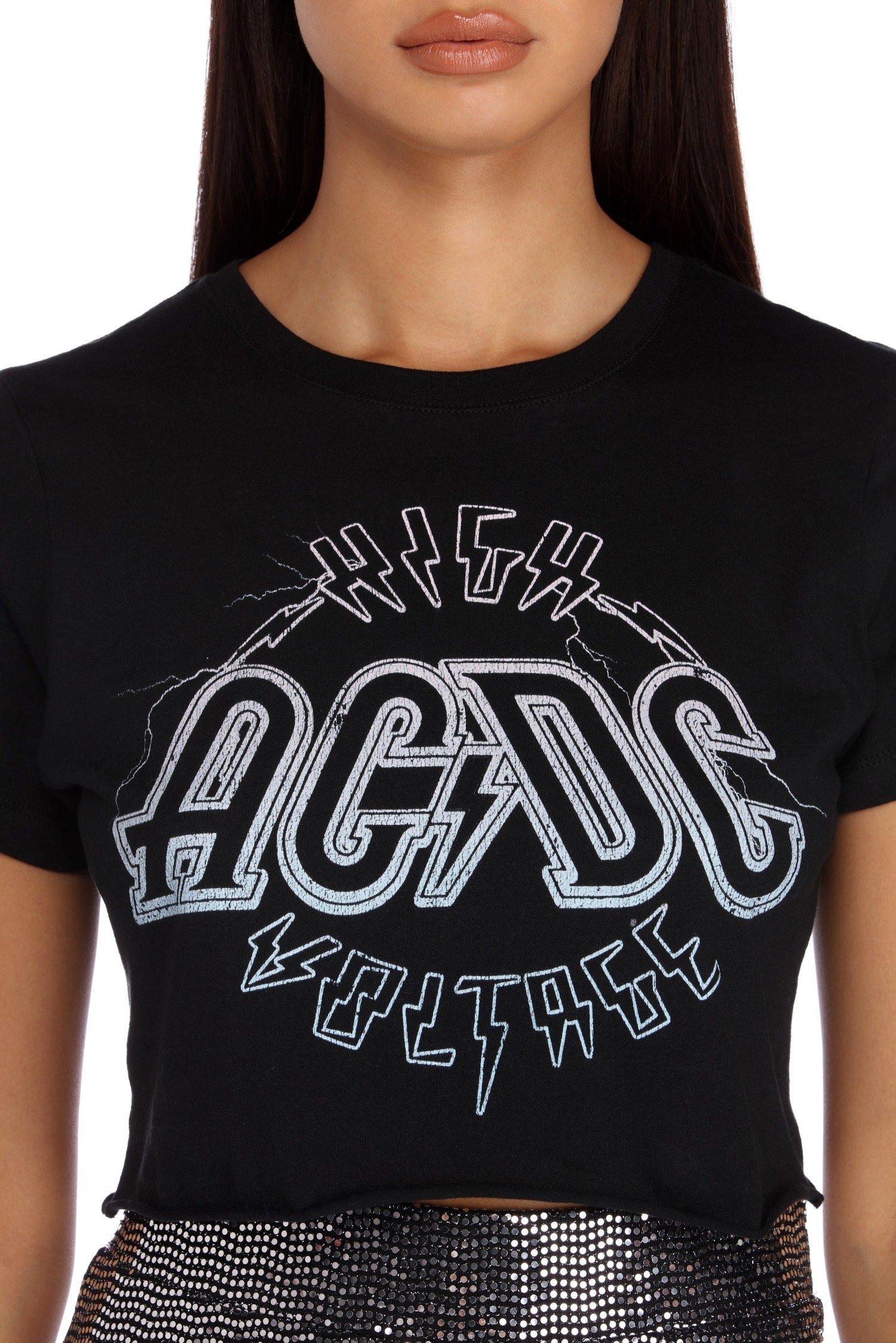Get lost in that high voltage rock 'n' roll! This cute AC/DC tee has a basic crew neck paired with short sleeves and a cropped, raw hem. The graphic tee is composed of a basic knit that offers plenty of stretch and features a High Voltage AC/DC graphic print.