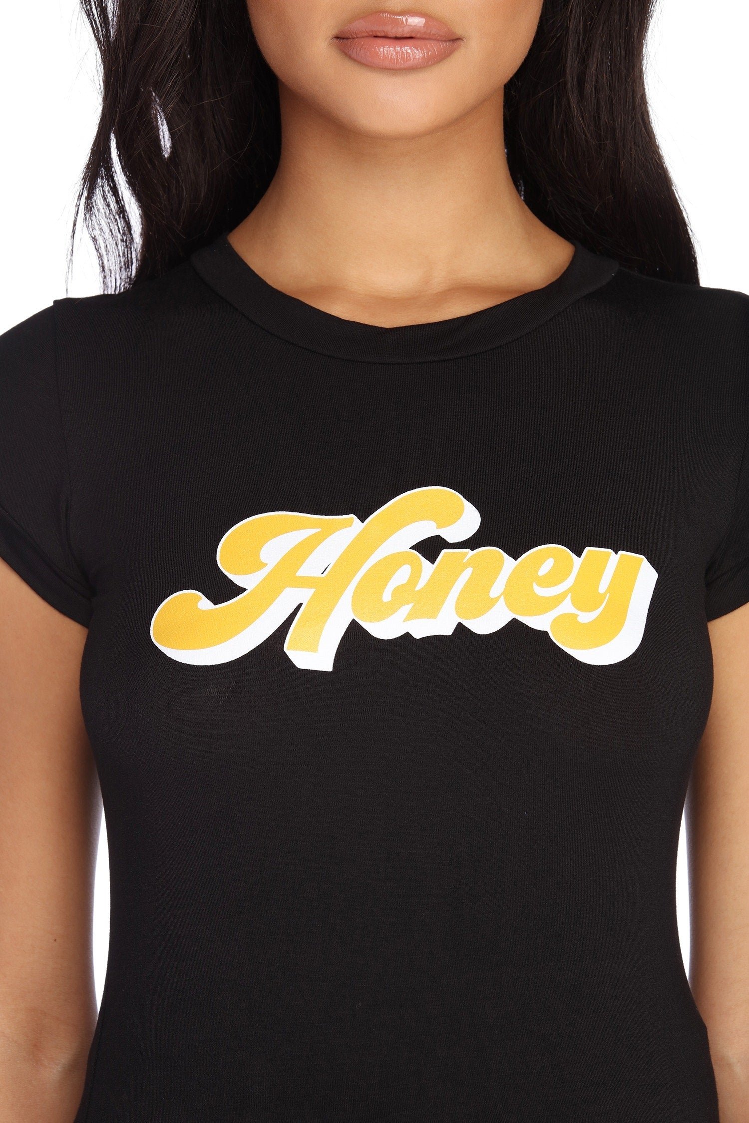 You're sweet like honey, and this graphic tee was made for you! It features a crew neckline, short sleeves, and the script "Honey" in a bubbly yellow font. The black top is composed of a stretchy knit fabric.
