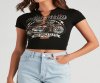 Ride like a babe wearing this graphic crop tee! It features short sleeves, a crew neck with a slit and safety pins, and a front script that reads "Classic American Motorcycles" on stretchy jersey knit fabric. Complete your edgy look in