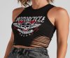 Your new ride or die graphic top! Show your edge in this crop tank top featuring a sleeveless, crew neck, a front script that reads, " Motorcycle/New York", and cool side slash detail. Complete your cool-girl vibe in distressed denim