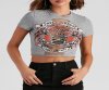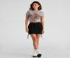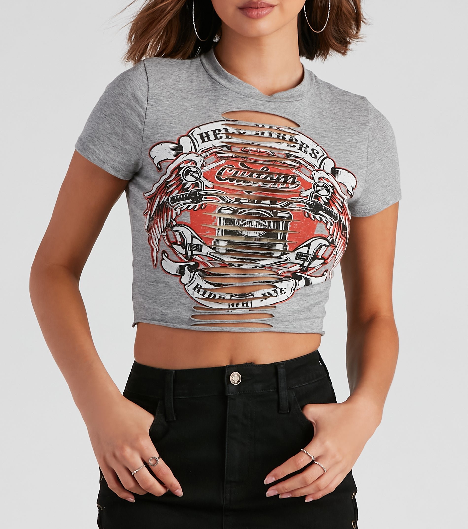 Feel the need for speed with this moto graphic tee! It features cap sleeves, a crew neck, and front moto graphic detail with slash slit accents and a raw cropped hem. Complete the look in a sleek