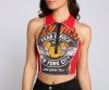 Rock on with a graphic tank that says it all! The tank features a collared neckline with a zipper, an image of eagle wings with roses, a rocker-inspired graphic that reads: "Fear of Rock, New York City", contrast stitching, and a cropped hem. Complete look with high waist shorts and