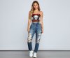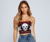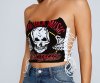You'll look like a total rocker babe in this edgy cropped graphic bustier! It features a strapless neckline, sexy lattice side detailing, a center skull graphic with the script "Hard Rock Music Festival," and a cropped, form-hugging fit. Style this bustier with