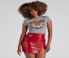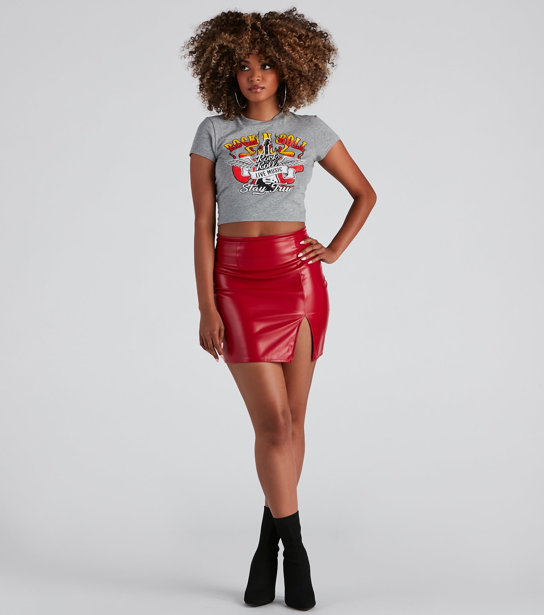Unleash your inner rock babe! This trendy graphic tee features cap sleeves, a crew neck, and a front graphic with a script that reads, "Rock N Roll, Stay True" on a cropped hem. Complete the look in a sleek