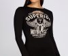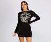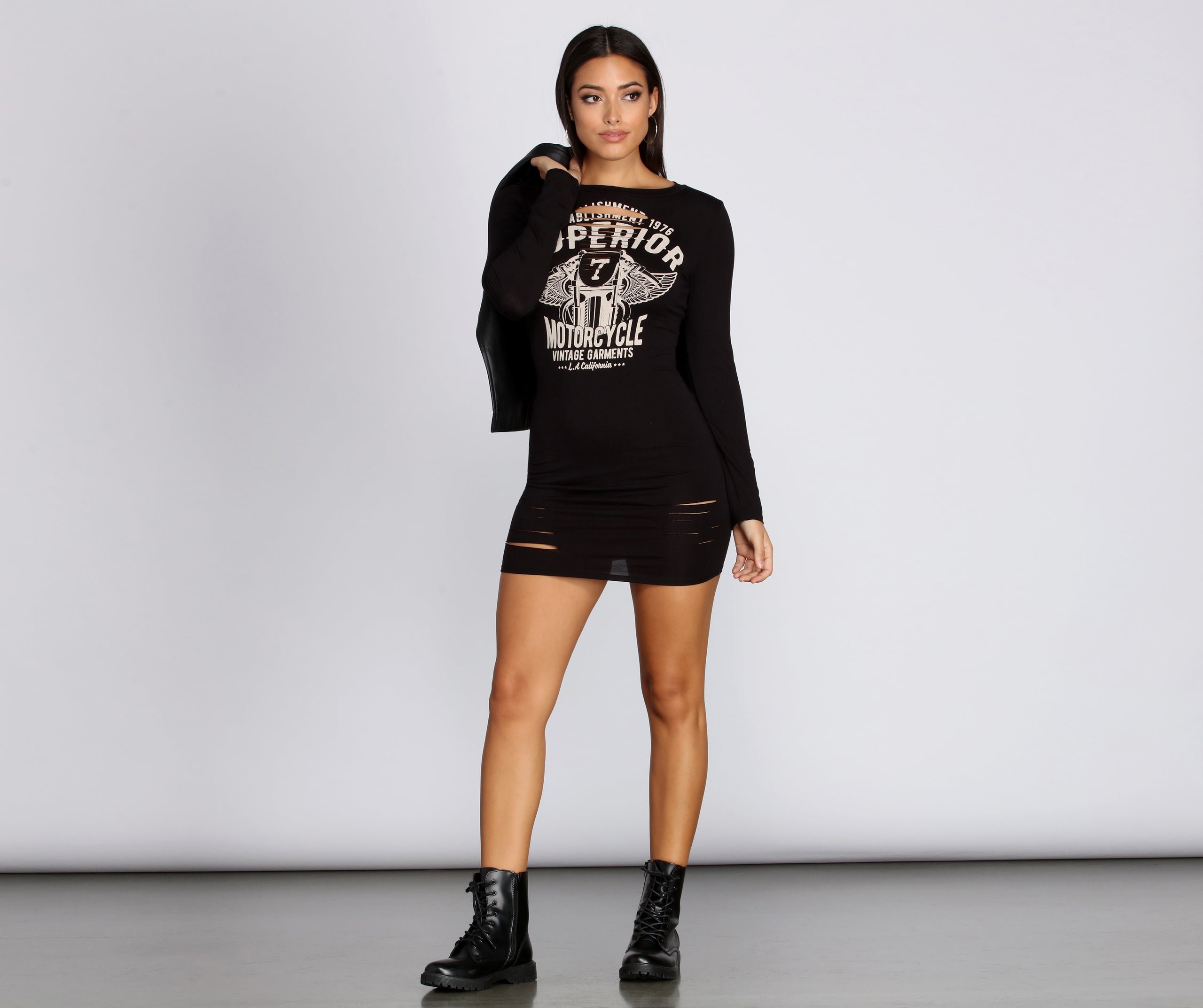 Give your look some serious edge with this mini dress! It features a round neckline, long fitted sleeves and a mini length silhouette with slashed distressed detailing. The graphic at the center of the bodice features a motorcycle with wings and a graphic that reads: " Superior Motorcycle Vintage Garments." Mini dress is composed of a cotton-blend fabric that offers a curve hugging fit with a moderate stretch.