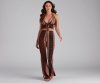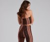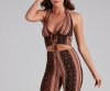 Bring the bohemian flair to your festival 'fit with this trendy halter top. It features a sleeveless plunging V-neckline, halter straps, dual tie-front details, a cropped form-hugging fit, and an all-over bohemian-inspired print. Style with the matching flare pants.