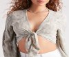 Style up this breezy tie-front top for a total beach babe look! The lightweight gauze top features long peasant sleeves with cinched hems, a V-neckline with a tie-front design, a fitted, cropped hem, and a subtle palm leaf print. Wear it alone with