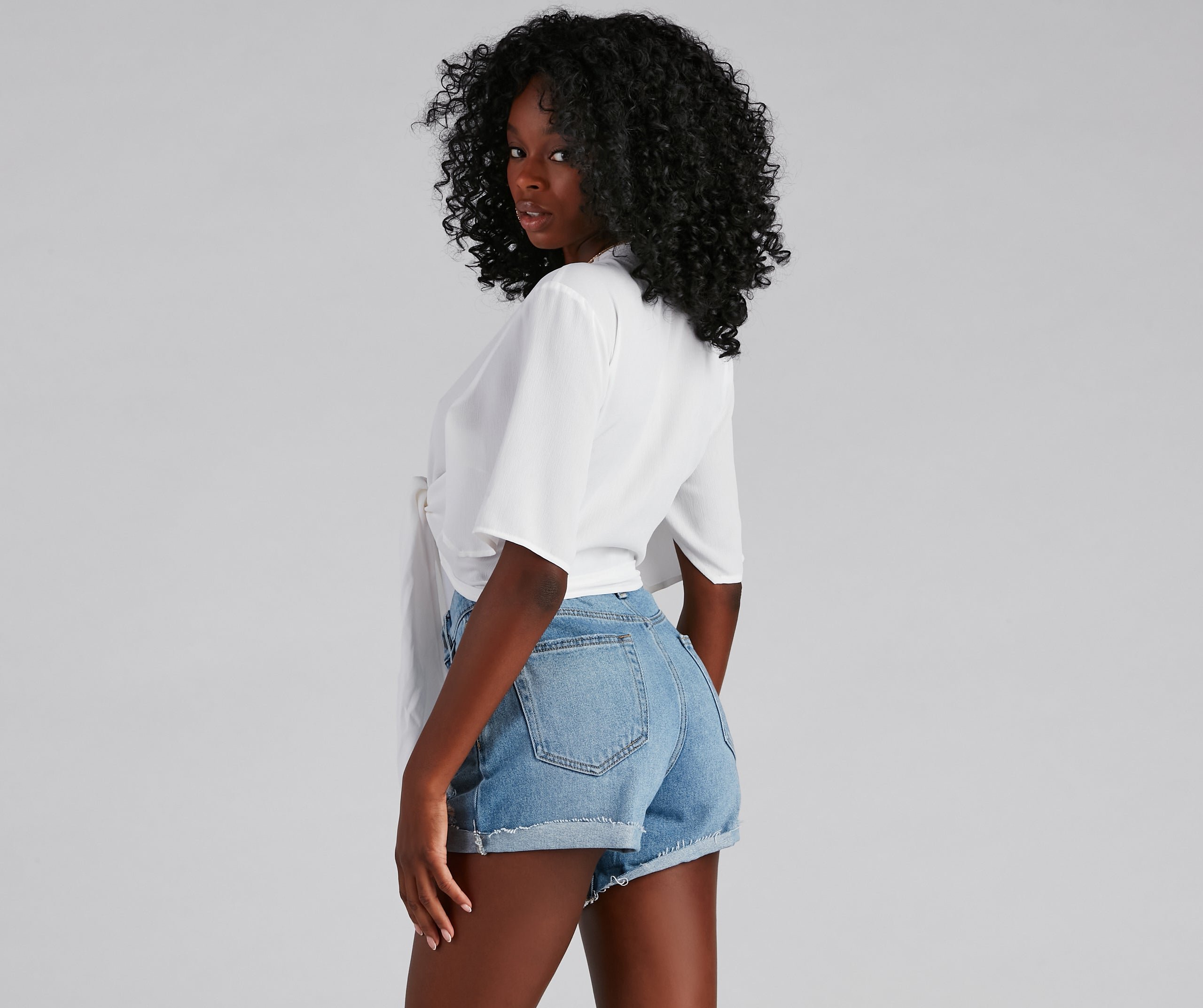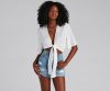 Stun with a sleek tie-front kimono that can be layered or worn alone. The kimono features a plunging V-neckline, kimono sleeves, and a cropped hem. The top is composed of a lightweight woven fabric that offers a relaxed fit with minimal stretch. Complete look with