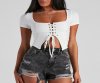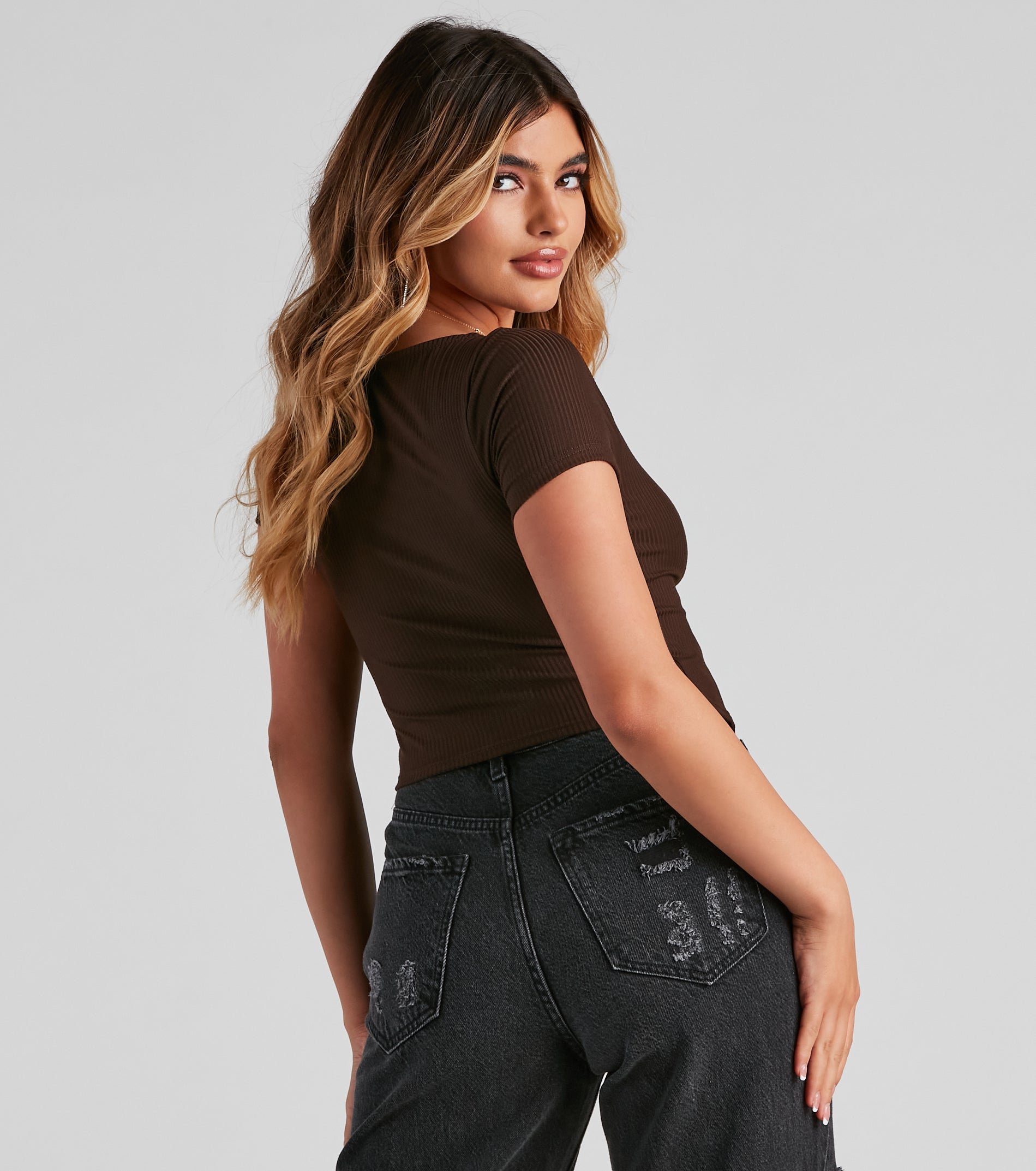 Get drawn in this cute crop top! The top features a square neckline, short sleeves, a lace-up front, and a cropped hem. The top is composed of a ribbed knit fabric that offers a form-hugging fit with a moderate stretch. Complete the look with