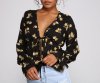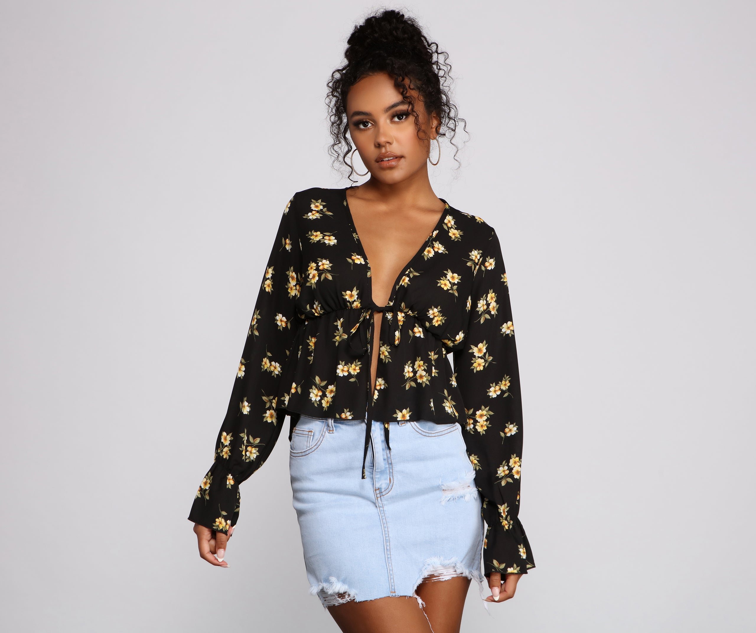 Fall in love with this adorable floral blouse and add a flirty vibe to your outfit! It features long blouson sleeves with flared hems, a V neckline, an elastic banded seam under the bust leading to a center tie-front, and a flowy, mid-length hem. The top is composed of a lightweight semi-sheer woven fabric with an all-over floral print and no stretch. Pair this blouse with