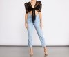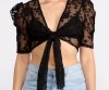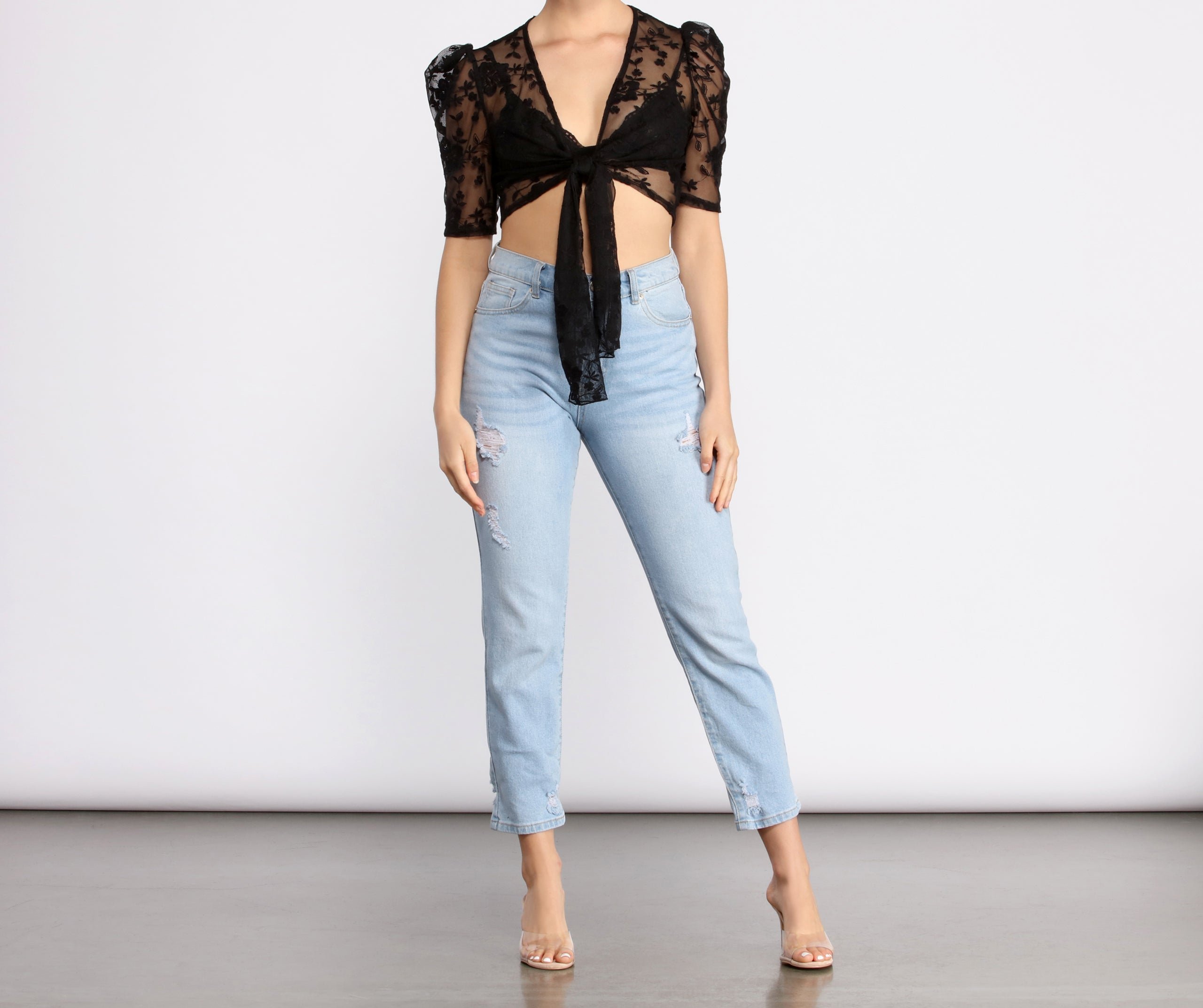 Showcase stunning looks in this sheer floral tie front top! The puff shoulder detailing is so of the moment! Pair with some high rise denim and chic strappy heels.