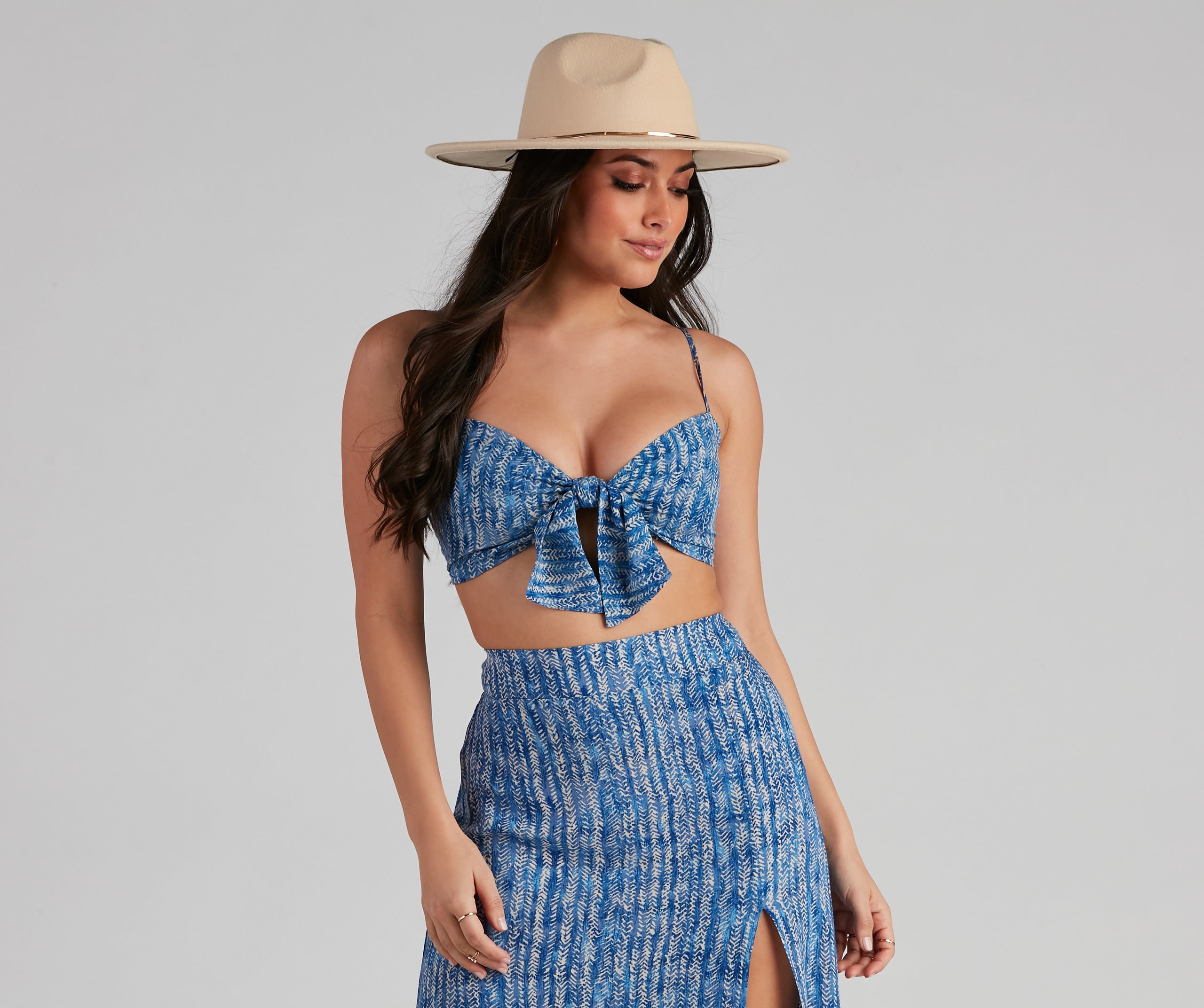 Grab the girls, book the flight, and pack this cute boho tie-front top! It features a sleeveless V-neck, spaghetti straps, and a smocked back. Complete the look in the matching skirt.