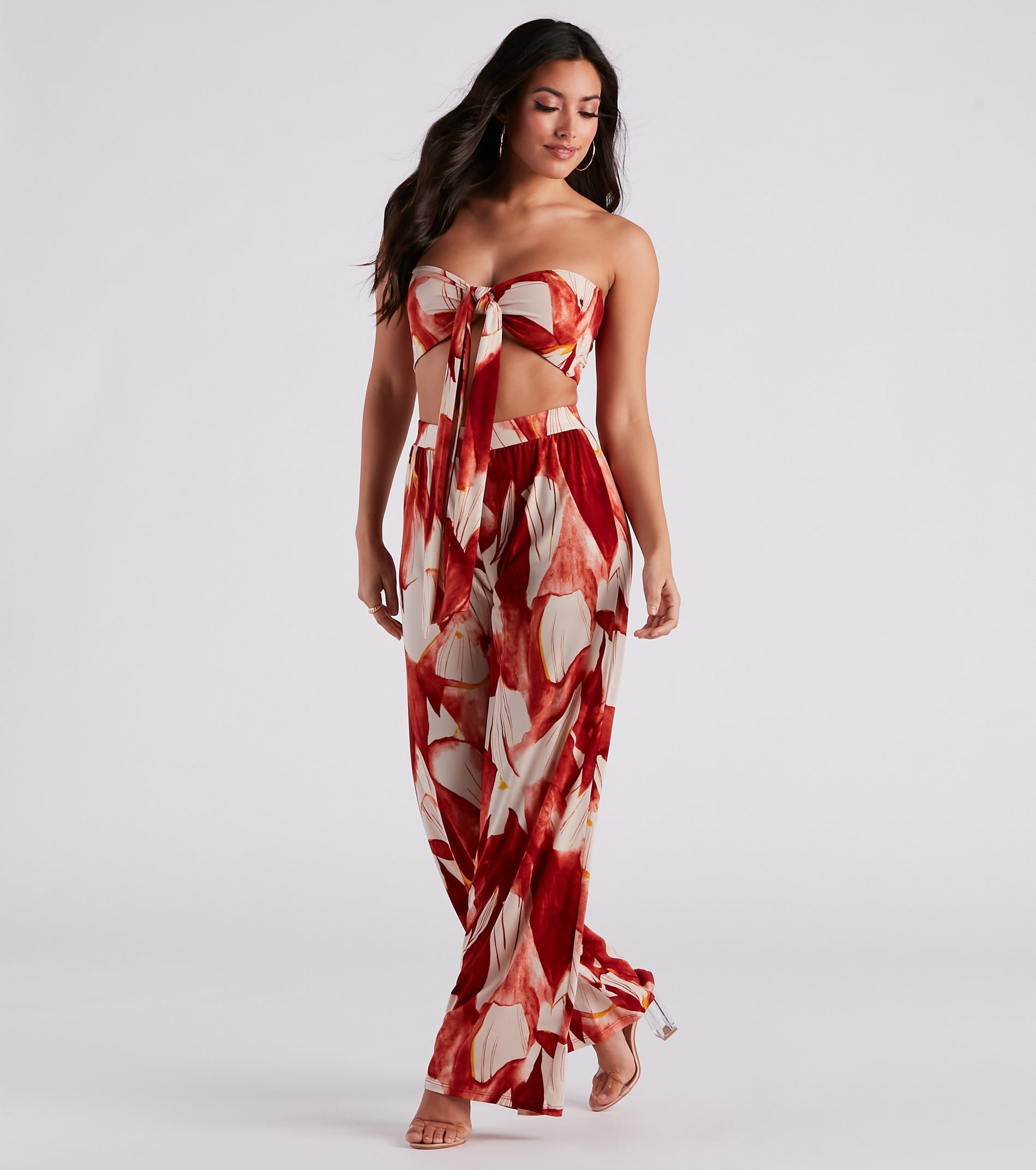 You'll be on total island time in this bold floral tube top! It features a strapless sweetheart neckline, a tie-front design that can also be styled as halter straps, an ultra-cropped, fitted hem, and an abstract floral print pattern that will draw everyone's attention to your chic look. Style with the matching wide-leg pants for a vacay-ready 'fit.