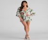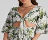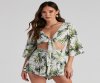 Life's a breeze under the palm trees in paradise! Create an effortless vacay vibe in this breezy crop top featuring 3/4 length kimono sleeves, a plunge V-neckline, and a tie-front closure on palm print fabric. Complete the look in the matching shorts.