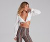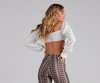 We're totally crushing on this adorable crop top, perfect for creating an effortless look! It features a deep V-neckline with a tie-front design, long puff sleeves with tapered, flared-out hems, and a majorly cropped fit. Style this top with