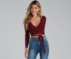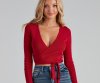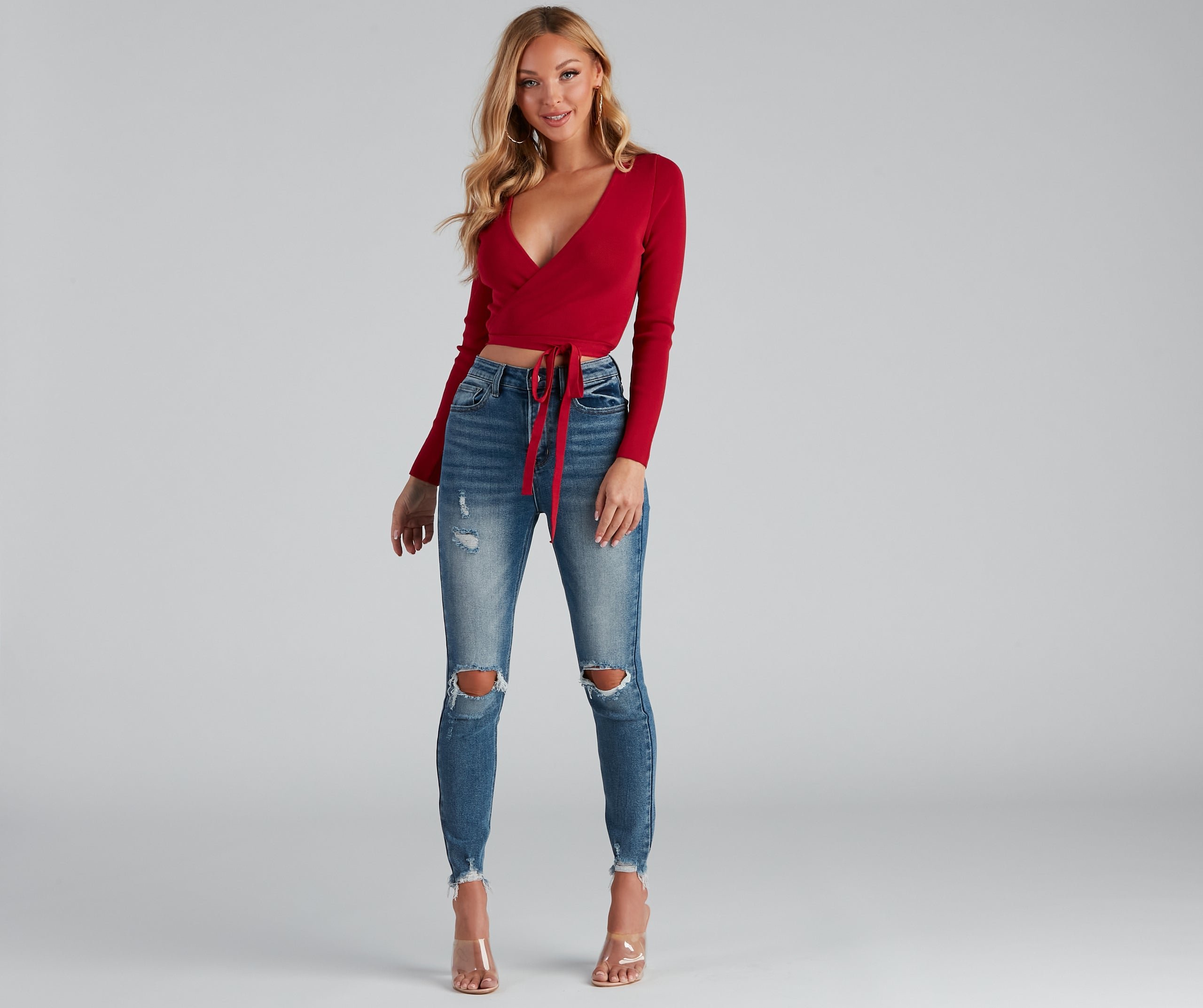 Look and feel pretty in this surplice wrap sweater featuring long sleeves and a cropped hem. Composed of a nylon-blend knit fabric with a moderate stretch. Perfect for styling with a mini