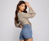 Bring a sassy style to your everyday look with this on-trend cheetah print top! It features long blouson sleeves, a V neckline, a tie detail that can be worn in the front or the back, and a cropped hem. Pair this top with