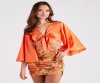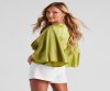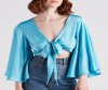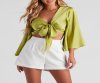 Silky and so chic! Luxe up your look in this satin crop top featuring three-quarter-length kimono sleeves, a plunge V-neckline, a tie-front closure, and a cropped hem. Complete the look in trouser
