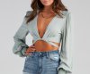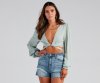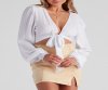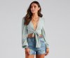 Get ready to relax and watch the sunset on your next getaway in this breezy tie-front top. It features long bishop sleeves with tapered smocked hems, a tie-front design creating a V-neckline, and a cropped fit. Style this lightweight gauze top with