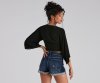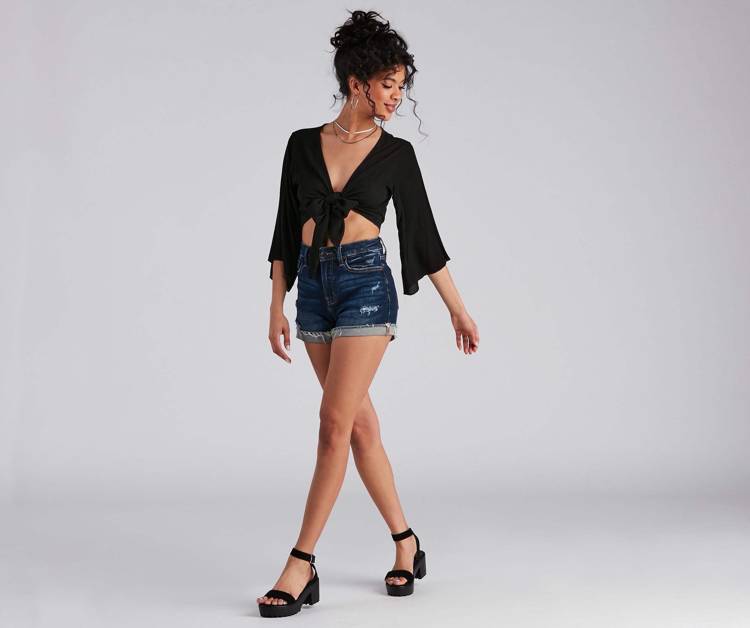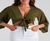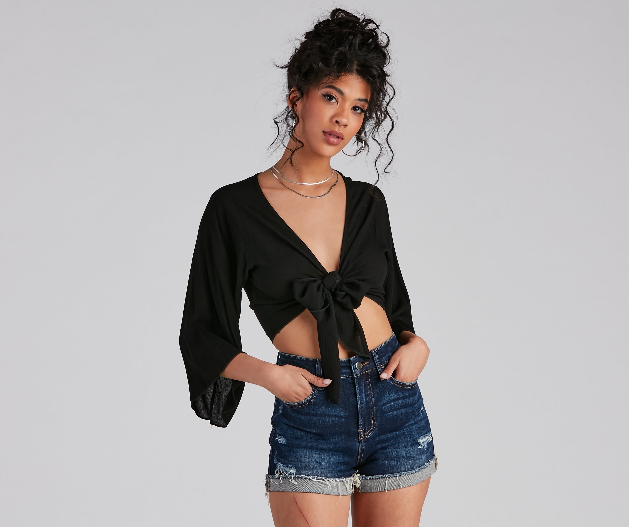 The styling options of this kimono sleeve top may cause you to be late! It features 3/4 length sleeves, a plunge v-neck with a sassy tie-front on crinkle woven fabric. Complete the look in distressed denim