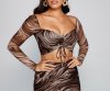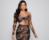 Keep your outfit trendy and on point with this marble-printed mesh crop top! It features an off-the-shoulder sweetheart neckline, long sheer fitted sleeves, a cute tie-front adjustable drawstring, and a cropped, form-hugging fit. Style this top with the matching midi skirt and strappy heels.